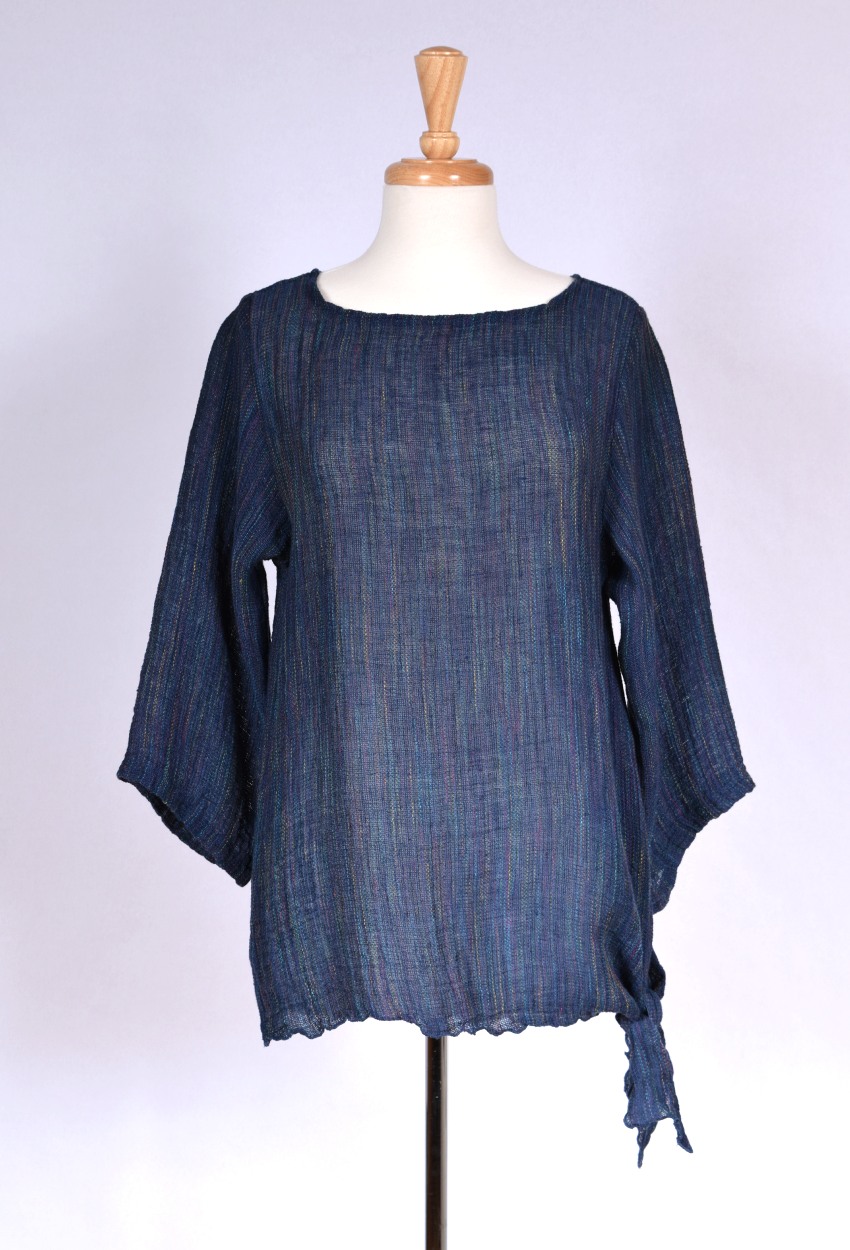 Our exclusive Italian linen-blend mesh has a naturally rumpled texture with multi colored threads woven in for unique color play. This versatile tunic has long points on one side that can be worn loose or tied for two distinctly different looks. It has a flattering boat neck and 3/4 sleeves.